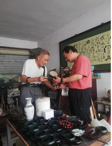 马长勇(右)与李庆山一起研究漆艺(受访者供图)