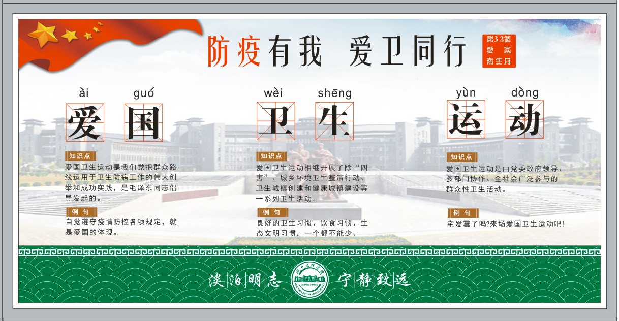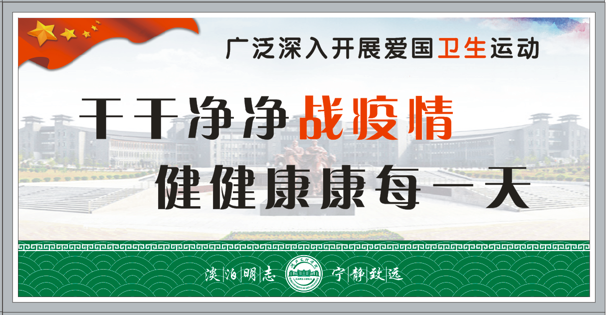 (宣传部 通讯员 胡旭)近日,根据省、市新冠肺炎疫情防控指挥部要求,学校深入开展爱国卫生运动。4月2日,记者看到,学校公共区域路面干净整洁,各单位各部门值班人员办公室、实验室全面消杀、窗几明净。学校北大门附近、南北区学生宿舍区域均设置有爱国卫生运动宣传展板。