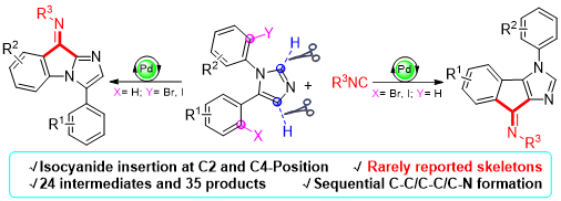 咪唑是一类多功能的结构骨架,在药物研究、功能材料和合成化学中都有重要的应用。同时,咪唑衍生物也表现出广泛的生物活性,包括抗癌、抗炎、抗菌和抗高血压活性。因此,开发高效合成咪唑骨架的策略一直受到有机化学家们的广泛关注。和平与任志林团队的该项研究通过钯催化异腈插入和咪唑的C2和C4位的C(sp2)-H功能化反应,顺利得到了两种鲜见报道的indeno[1,2-d]imidazole和imidazo[1,2-a]indole骨架。该成果的第一作者为任志林博士,通讯作者为和平教授,食化学院为第一完成单位,化学工程与工艺专业17级本科生刘莹莹和解银庆等参与了部分研究工作。