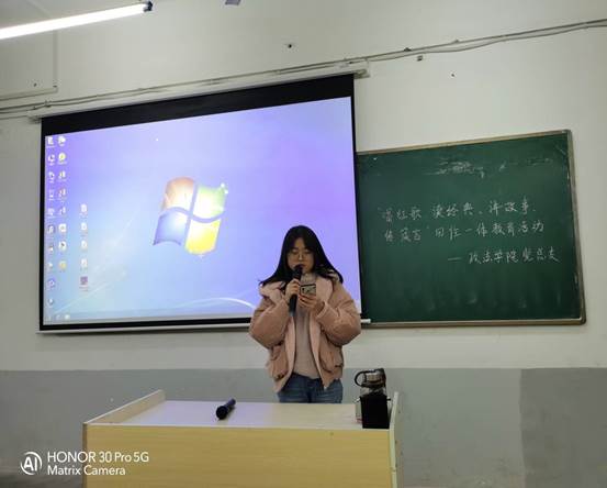 活动共分四个环节,第一个环节是唱红歌。同学们或单独演唱,或成群结伴,演唱了《国际歌》、《我和我的祖国》等经典的红色歌曲;第二个环节是讲故事。同学们声情并茂,《刘胡兰》、狼牙山五壮士》等脍炙人口的故事从他们口中娓娓道来,传承红色基因和革命文化;第三个环节是传箴言,传颂《星星之火,可以燎原》、《可爱的中国》等耳熟能详的作品,让同学们对革命过程的艰难曲折有了更为深刻的理解;第四个环节是读经典,通过诵读《论持久战》和《保卫延安》两部经典著作,对革命道路的选择和发展了解更为透彻和深入。