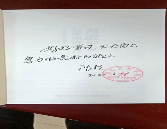 (资环学院 通讯员 罗漪)“收到书本的那一刻,我真的有点儿想哭。看到张院长亲自为我写的祝福语,让我感受到了学院浓浓的情谊”。“看到学院精心准备的毕业礼物,我深深地感受到学习将是我追逐人生梦想的重要事情。”……为鼓励毕业生坚持读书学习、实现人生梦想,资环学院为2020届毕业生举行了“以书为友、筑梦远航”的赠书活动,选择将《习近平的七年知青岁月》这本书作为毕业纪念送给即将毕业的113名学生,并由院长张弢教授亲自为每一名毕业生签上祝福语。“好好学习,天天向上,努力做最好的自己”一句简单的毕业寄语,饱含着学院对资环学子即将“卧龙出山”放飞梦想的期许,饱含着愿毕业学子鹏程万里的深深祝福!