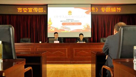 (政法学院 通讯员 秦春蕾)9月24日下午,政法学院法学系博士何普应邀为市委宣传部、市委网信办干部讲授《民法典》。讲座由市委宣传部机关党委专职副书记刘蓉娇主持。