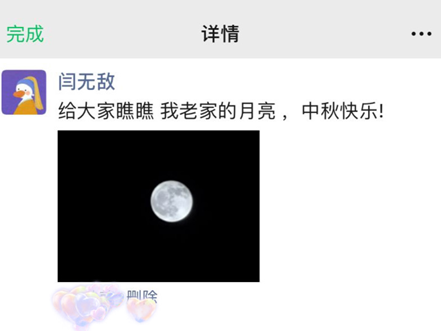 今年国庆假期正逢双节同庆,在全国人民共赏一轮明月之际,研究生会邀请全体研究生“智慧”赏月。美景不独赏,所有研究生均可以摄影、赏月心得感悟或自己的画作三种形式向大家分享与“月亮”的故事。新闻与传播专业的闫玉玺同学在微信朋友圈分享了自己的摄影作品,她说:“这次假期回到了老家,在用手机记录生活的时候,也恰好拍到了十五的一轮圆月”。